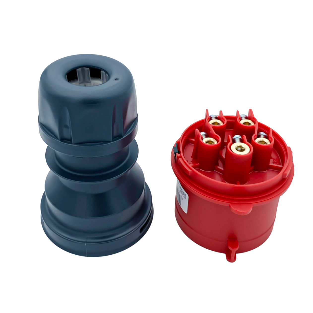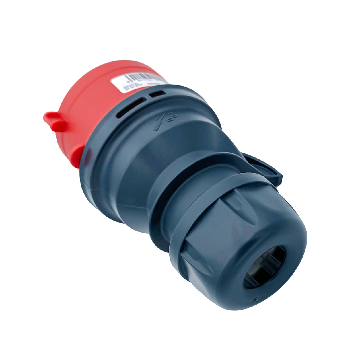 Robuuste CEE-stekker voor industriële toepassingen met een nominale stroomsterkte van 32 ampère bij 400 volt driefasenstroom. De versie met IP44 beschermingsklasse is spatwaterdicht en geschikt voor veilig gebruik in commerciële en mobiele stroomvoorzieningen.