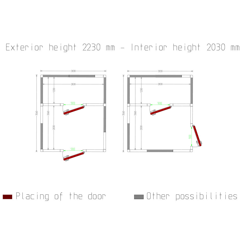 - Specifieke kamer met 2 zones voor positieve of negatieve temperatuur, wand-, vloer- en plafonddikte 100 mm, modulatie met panelen van 200 tot 1200 mm breed (200+200+200 enz.).