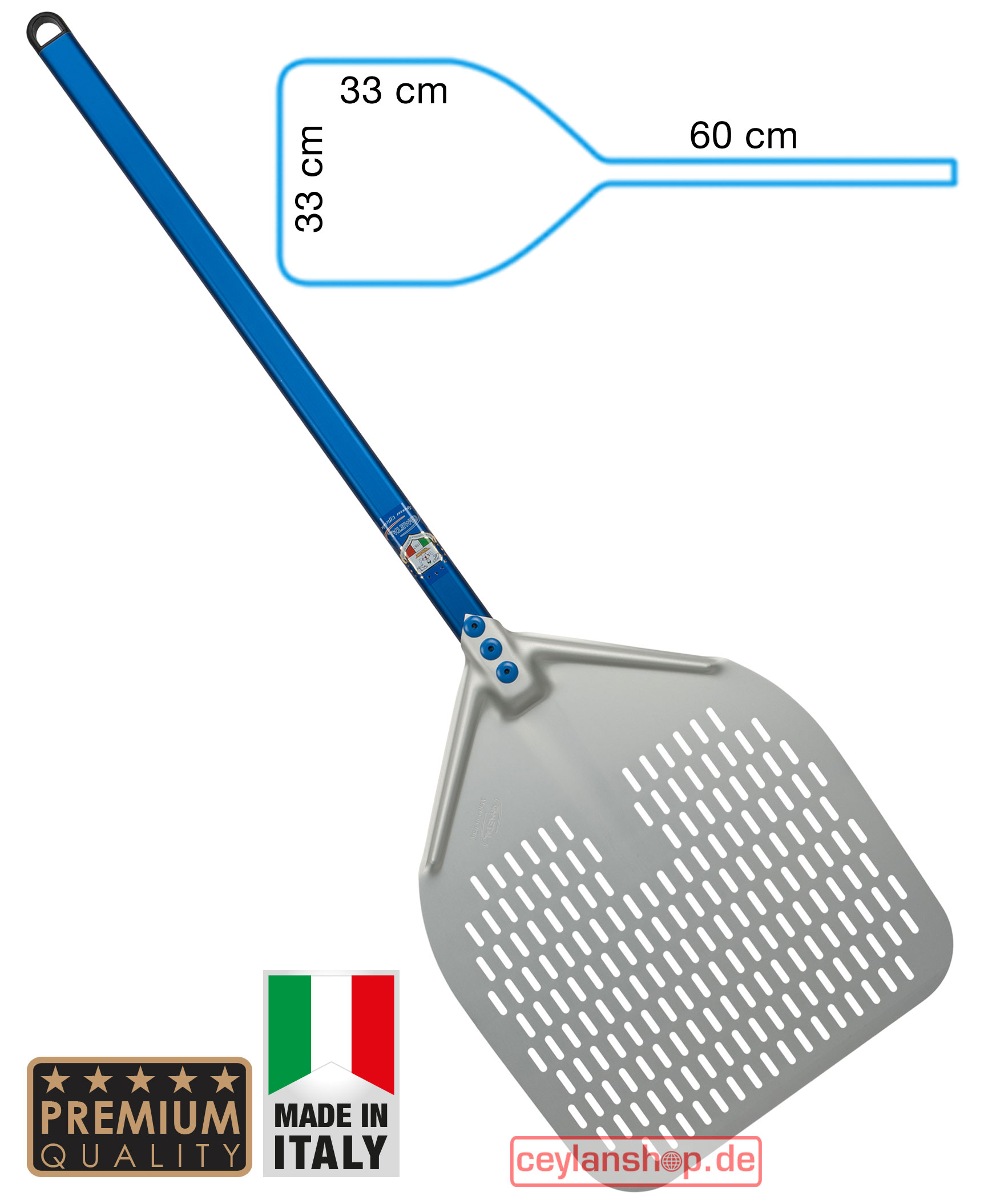 Gi.Metal Azzurra pizzaschep, geperforeerd – 33 x 33 cm, lengte handvat 60 cm