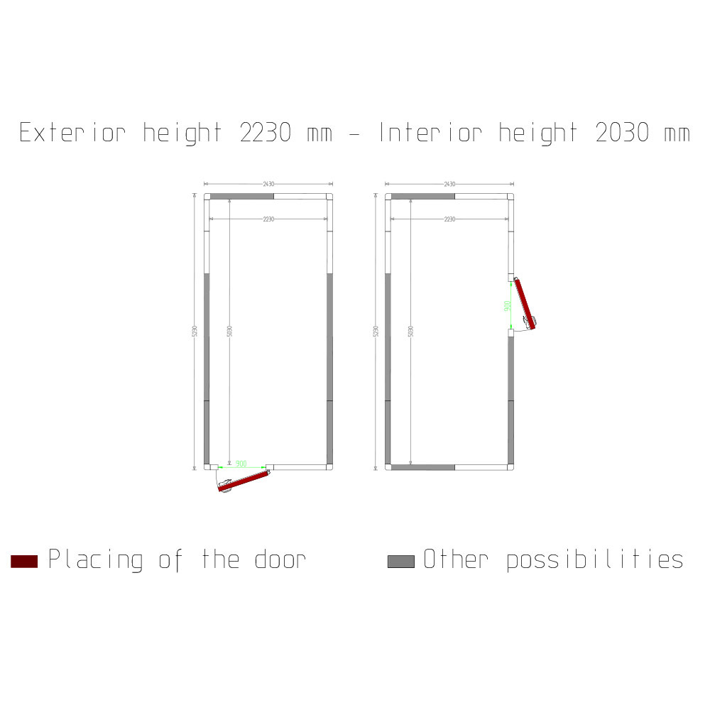 - Deur met nuttige doorgang 900xh1900 mm (keuze van deurpositie op 4 zijkanten).