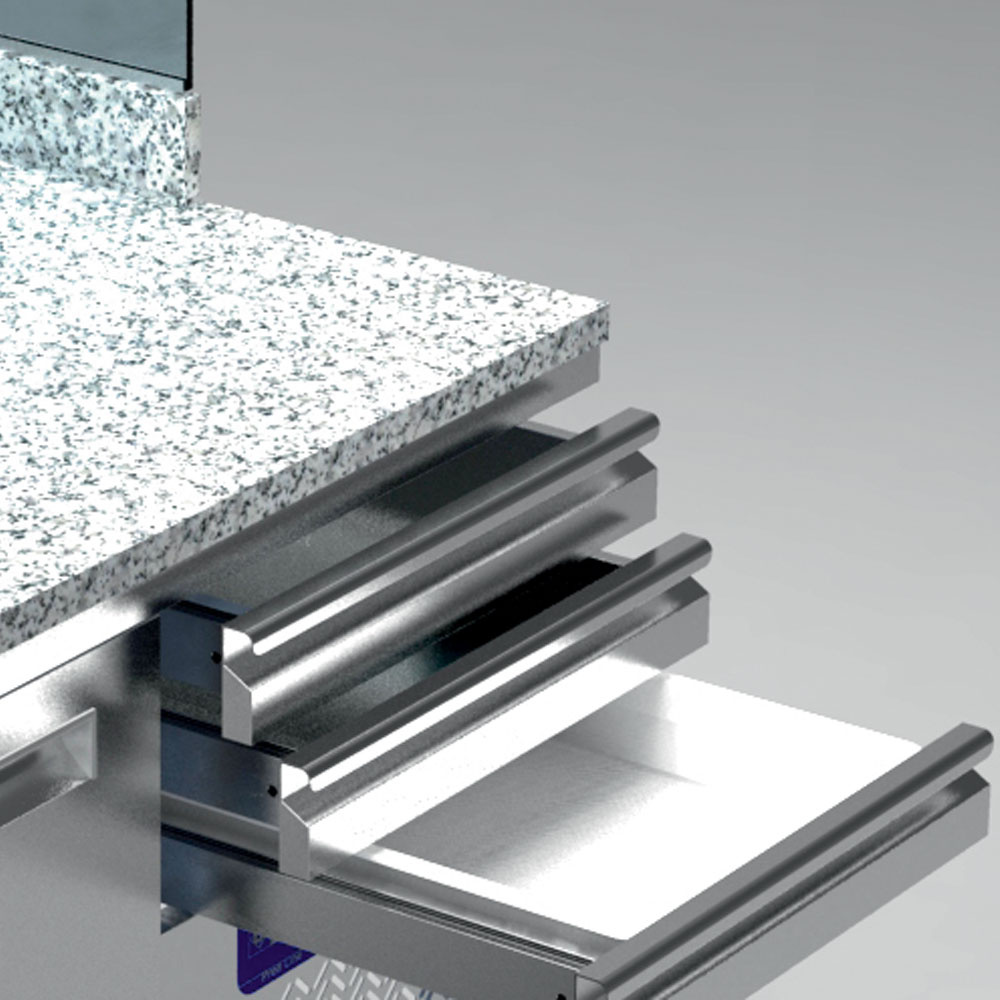 - Ingebouwde koelstructuur, met venster (ademscherm), 8x GN 1/4 h150 mm (lades optioneel).